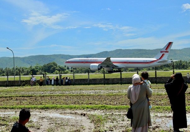 Sejumlah warga menyaksikan pesawat Garuda Indonesia yang membawa jemaah haji asal Aceh lepas landas dari Bandara Sultan Iskandar Muda (SIM), Aceh Besar (istimewa)