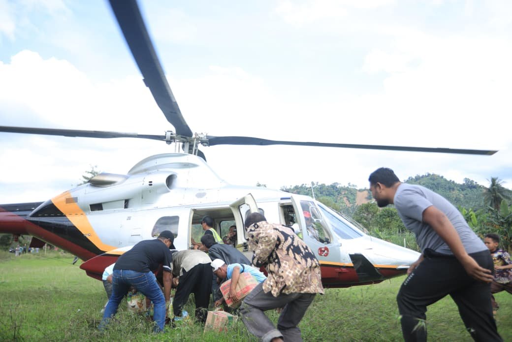 Bantuan logistik ke sejumlah daerah di Aceh Tengah terus dipasok menggunakan helikopter. Penyaluran lewat udara dilakukan karena akses ke lokasi sulit dijangkau jalur darat. Foto: IstRAKYAT ACEH | TAKENGON – Bantuan logistik ke sejumlah daerah di Aceh Tengah terus dipasok menggunakan helikopter. Penyaluran lewat udara dilakukan karena akses ke lokasi sulit dijangkau jalur darat.