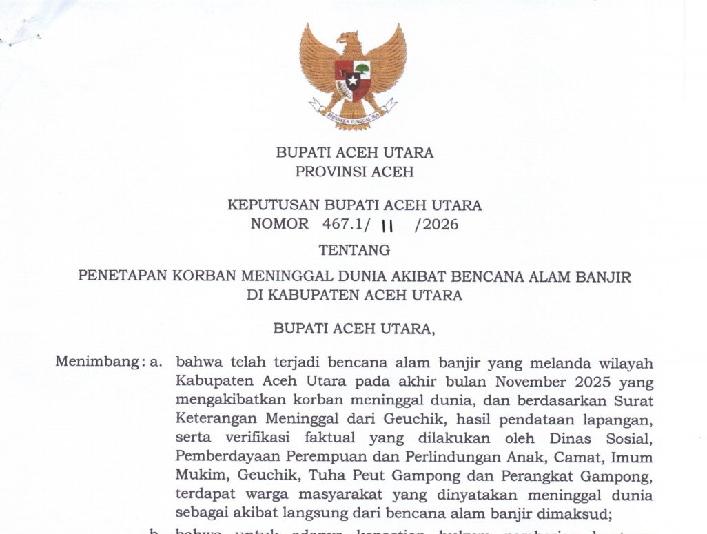 Rakyat Aceh | Lhokseumawe – Pemerintah Kabupaten Aceh Utara menetapkan 270 orang meninggal dunia akibat bencana banjir dan longsor yang melanda wilayah tersebut pada akhir November 2025. Penetapan ini tertuang dalam Surat Keputusan Bupati Aceh Utara Nomor 467.1/11/2026 tertanggal 19 Januari 2026, yang menjadi dasar penyaluran santunan kematian dari Kementerian Sosial Republik Indonesia.