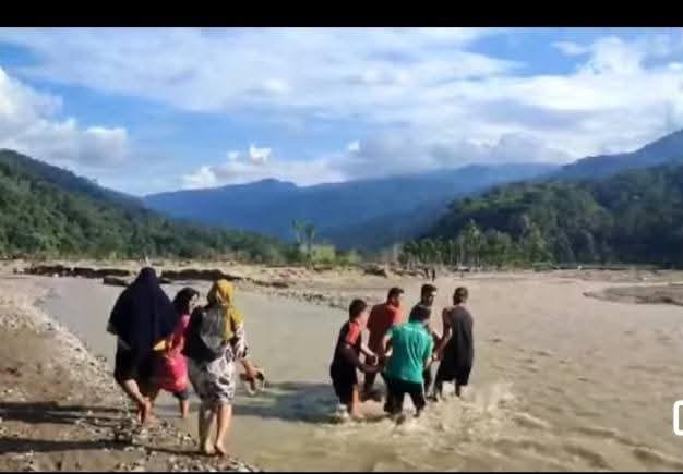 Masyarakat pining yang sedang sakit dipapah melintasi arus sungai untuk mendapatkan penanganan medis. Foto: IstGayo Lues (RA) — Luka masyarakat Kecamatan Pining, Kabupaten Gayo Lues, Aceh, belum juga sembuh pasca bencana hidrometeorologi. Alih-alih membaik, penderitaan justru kian dalam. Jembatan yang menjadi satu-satunya akses vital hingga kini tak kunjung terwujud, menyisakan kisah pilu yang terus berulang setiap hari.