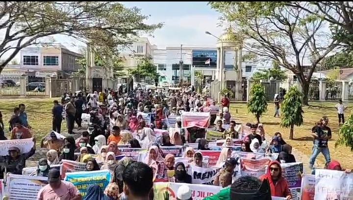 Ribuan masyarakat kepung kantor Bupati Bireuen tuntut hak bantuan korban bencana, Senin (6/4). AKHYAR RIZKI RAKYAT ACEHRAKYAT ACEH| BIREUEN – Gelombang kekecewaan akhirnya memuncak. Ribuan warga korban banjir dari berbagai penjuru Kabupaten Bireuen memadati halaman Kantor Bupati, Senin (6/4)