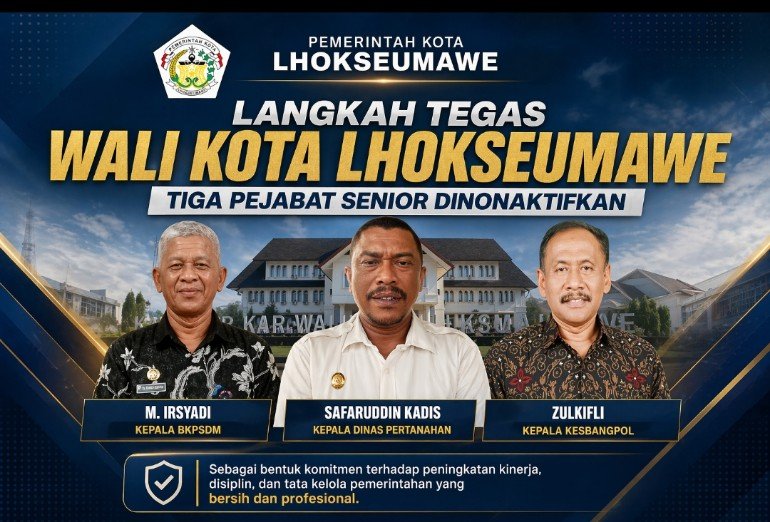 Pemerintah Kota Lhokseumawe kembali menjadi sorotan publik setelah Wali Kota Sayuti Abubakar mengambil langkah strategis dengan menonaktifkan sementara tiga pejabat eselon II, sebagai bagian dari upaya konsolidasi dan penguatan tata kelola birokrasi. ARMIADI/ RAKYAT ACEHRAKYAT ACEH | LHOKSEUMAWE– Pemerintah Kota Lhokseumawe kembali menjadi sorotan publik setelah Wali Kota Sayuti Abubakar mengambil langkah strategis dengan menonaktifkan sementara tiga pejabat eselon II, sebagai bagian dari upaya konsolidasi dan penguatan tata kelola birokrasi.