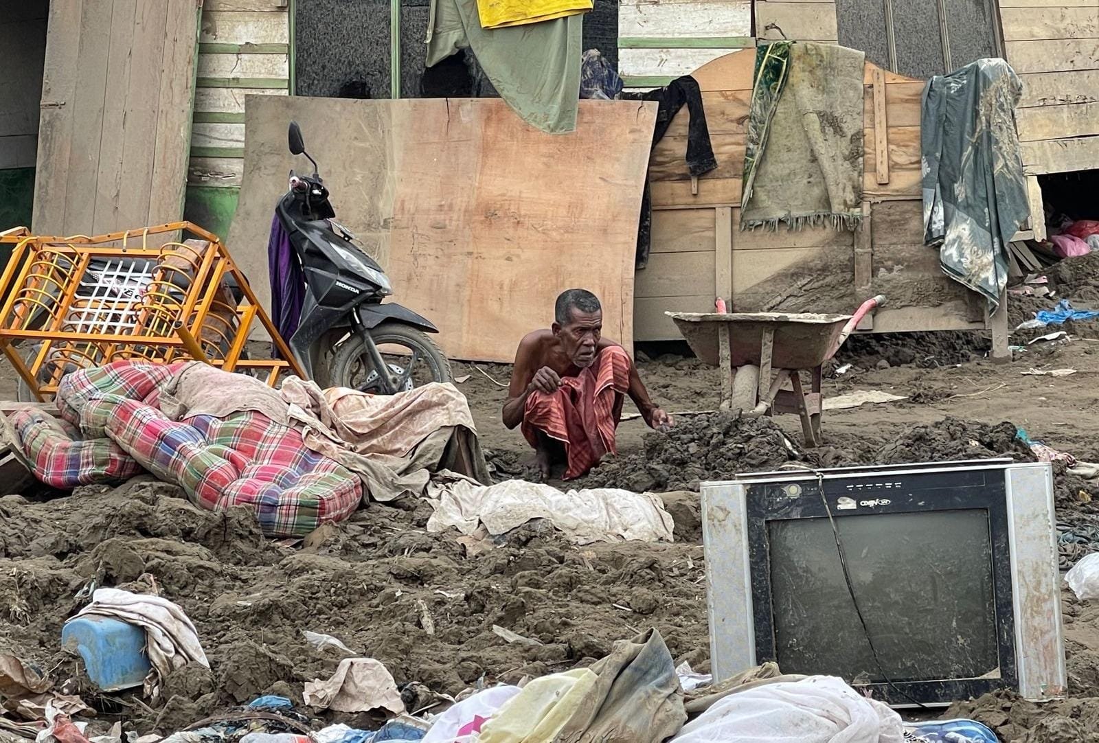 Ia menuturkan, lumpur di dalam rumah dan pekarangannya sudah dibersihkan selama satu bulan, namun tak kunjung tuntas. “Sudah sebulan kami buang-buang lumpur, tapi belum selesai juga. Capek, tapi mau bagaimana lagi,” katanya dengan nada sedih.