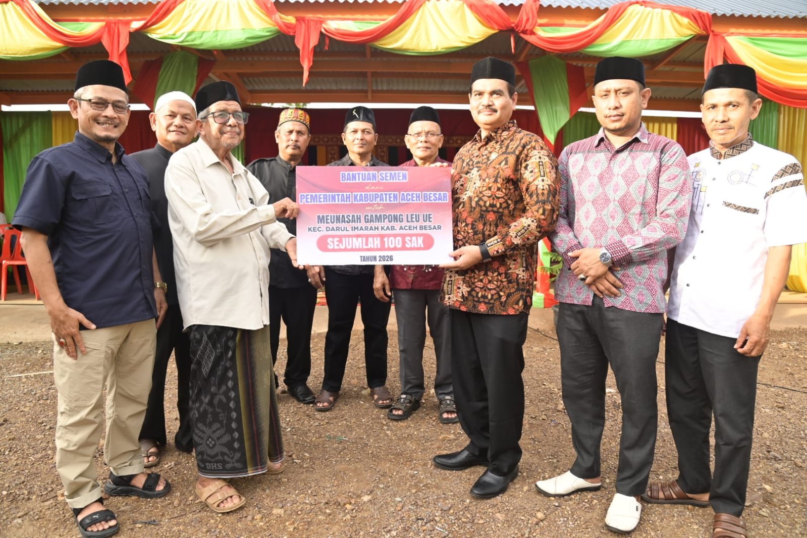 Kadis PMG Aceh Besar, Jakfar SP, M.Si, menyerahkan 100 sak semen secara simbolis kepada Imuem Meunasah Gampong Leu Ue di Pasar Mini BUMG Gampong Leu Ue, Kecamatan Darul Imarah, Aceh Besar, Kamis (19/2/2026). FOTO/MC ACEH BESARRAKYAT ACEH | KOTA JANTHO — Pukul bedug menjadi penanda dimulainya Bazar Ramadhan serba seribu sekaligus launching pemakaian meunasah Gampong Leu Ue yang telah direhabilitasi. Kegiatan tersebut berlangsung di Pasar Mini BUMG Gampong Leu Ue, Kecamatan Darul Imarah, Aceh Besar, Kamis (19/2/2026).