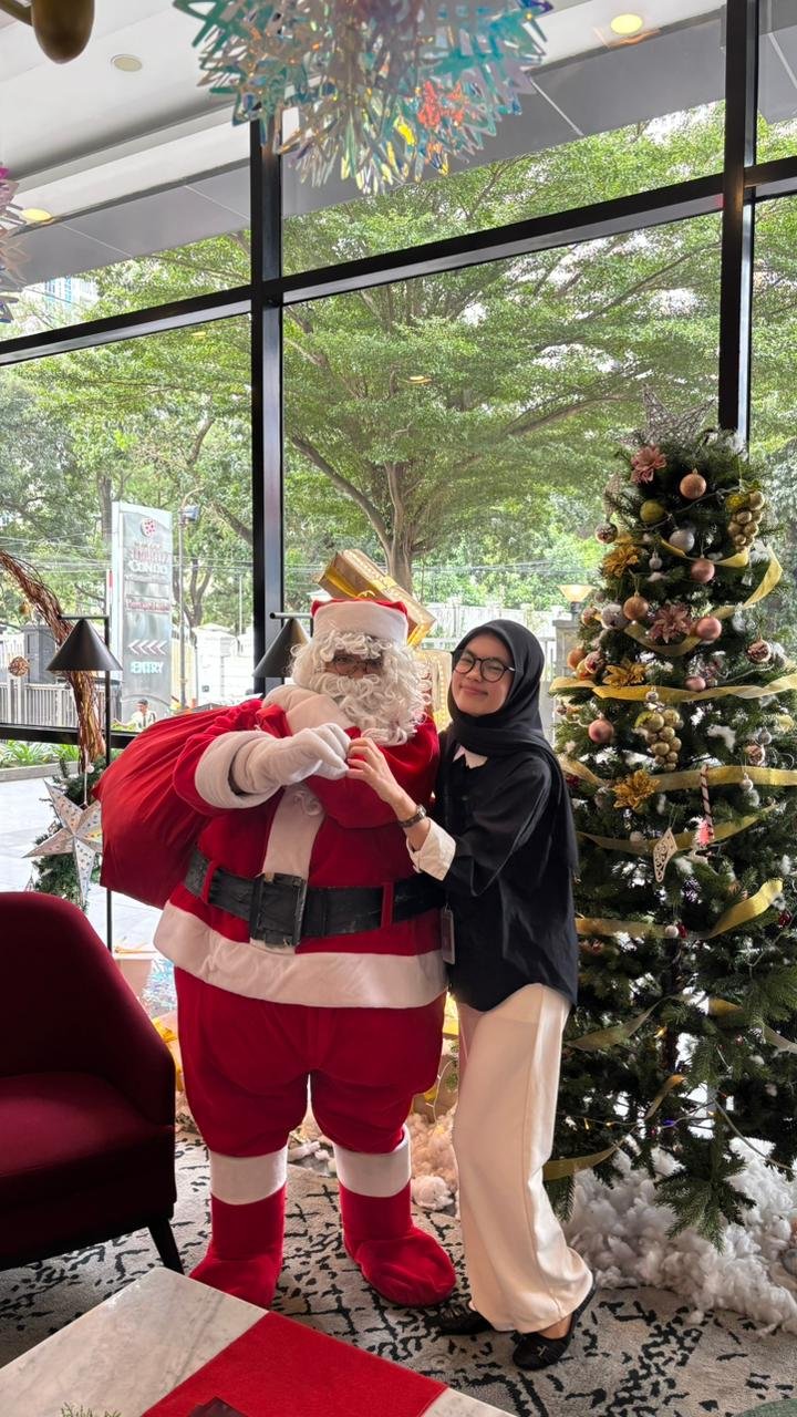Tak hanya itu, suasana Natal semakin terasa dengan kehadiran Santa Claus di area lobby hotel yang secara khusus menyapa dan membagikan berbagai makanan ringan seperti bolu, lollipop, yupi, jelly, dan aneka snack favorit anak-anak. Momen ini menjadi daya tarik tersendiri, terutama bagi tamu keluarga yang menginap bersama buah hati mereka.