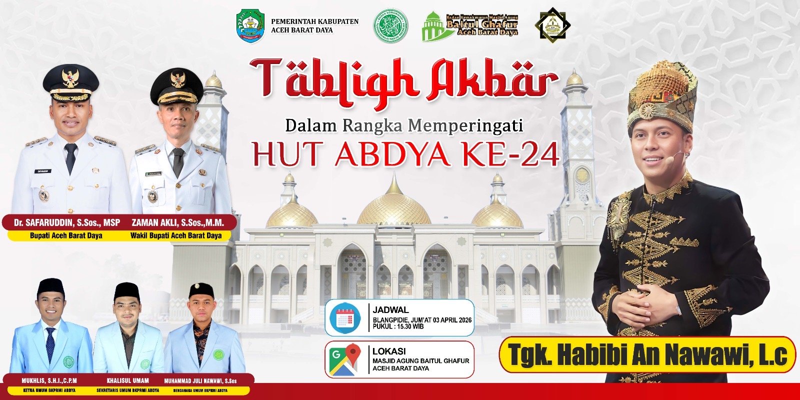 Acara yang sarat akan nilai-nilai keagamaan dan persatuan ini akan berlangsung usai Jumat nanti, 03 April 2026, mulai pukul 15.30 WIB di Masjid Agung Baitul Ghafur, Abdya.