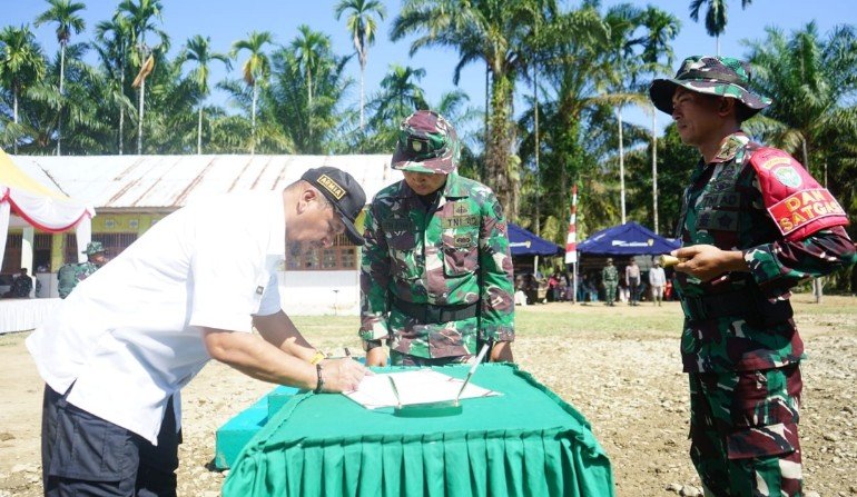 TANDA TANGAN: Penandatanganan naskah serah terima pekerjaan oleh Bupati Aceh Tamiang, Armia Fahmi kepada Dandim 0117/Aceh Tamiang sekaligus Dansatgas TMMD, Letkol Arm Raden Subhi Fitra Jaya yang dipusatkan di Desa Sulum, Kecamatan Sekerak, Rabu (22/4/2026). RAKYAT ACEH/ISTRAKYAT ACEH | ACEH TAMIANG -Program TNI Manunggal Membangun Desa (TMMD) ke-128 resmi dimulai di Kabupaten Aceh Tamiang. Upacara pembukaan yang berlangsung khidmat ini dipusatkan di Lapangan SMPN 7 Sulum, Desa Sulum, Kecamatan Sekerak, pada Rabu (22/4).